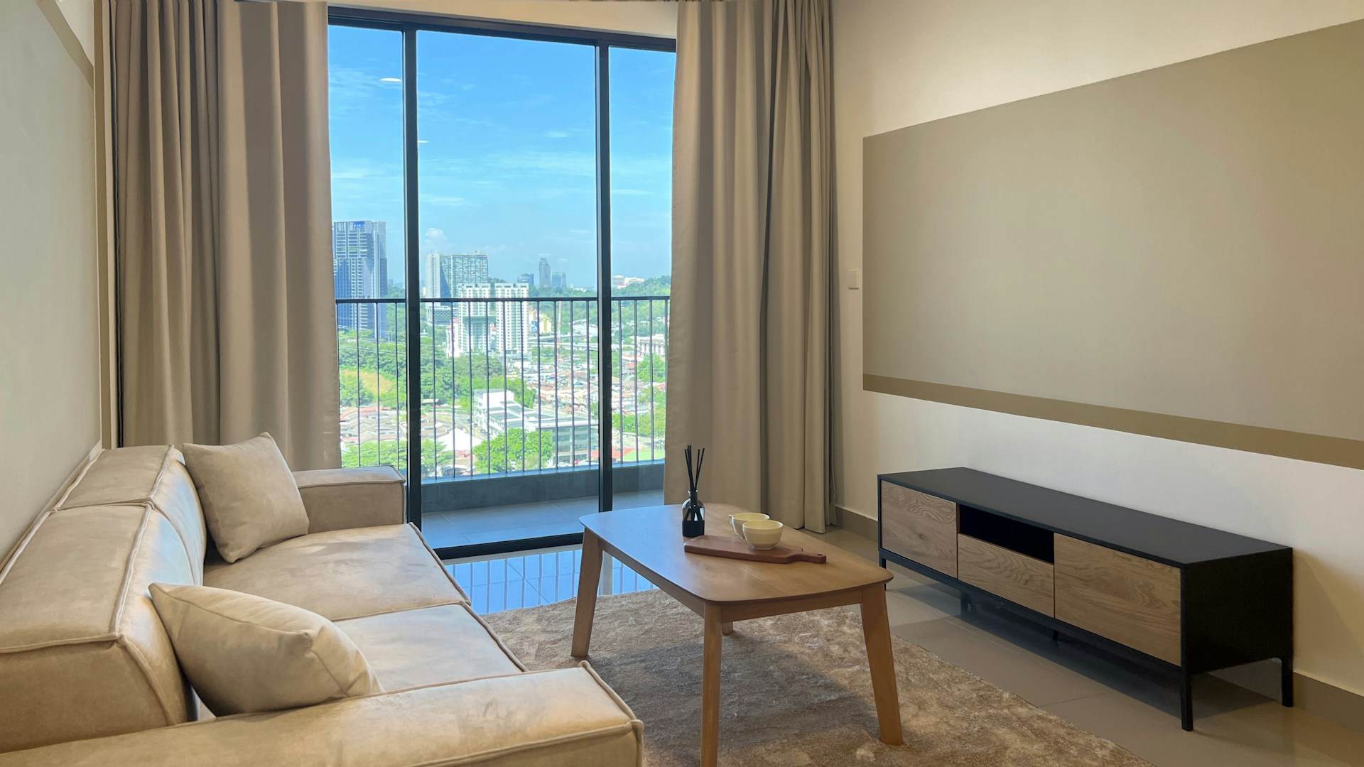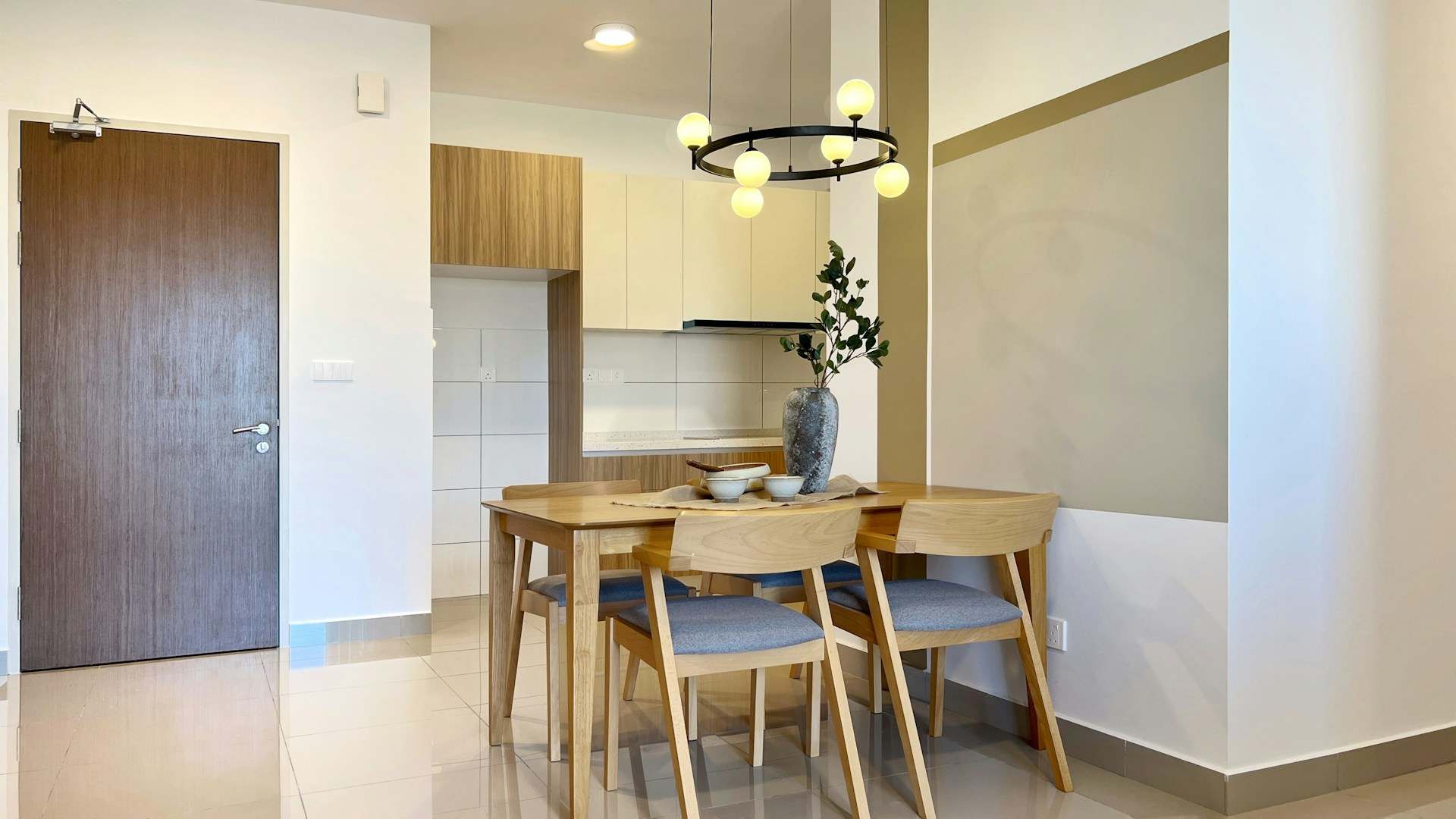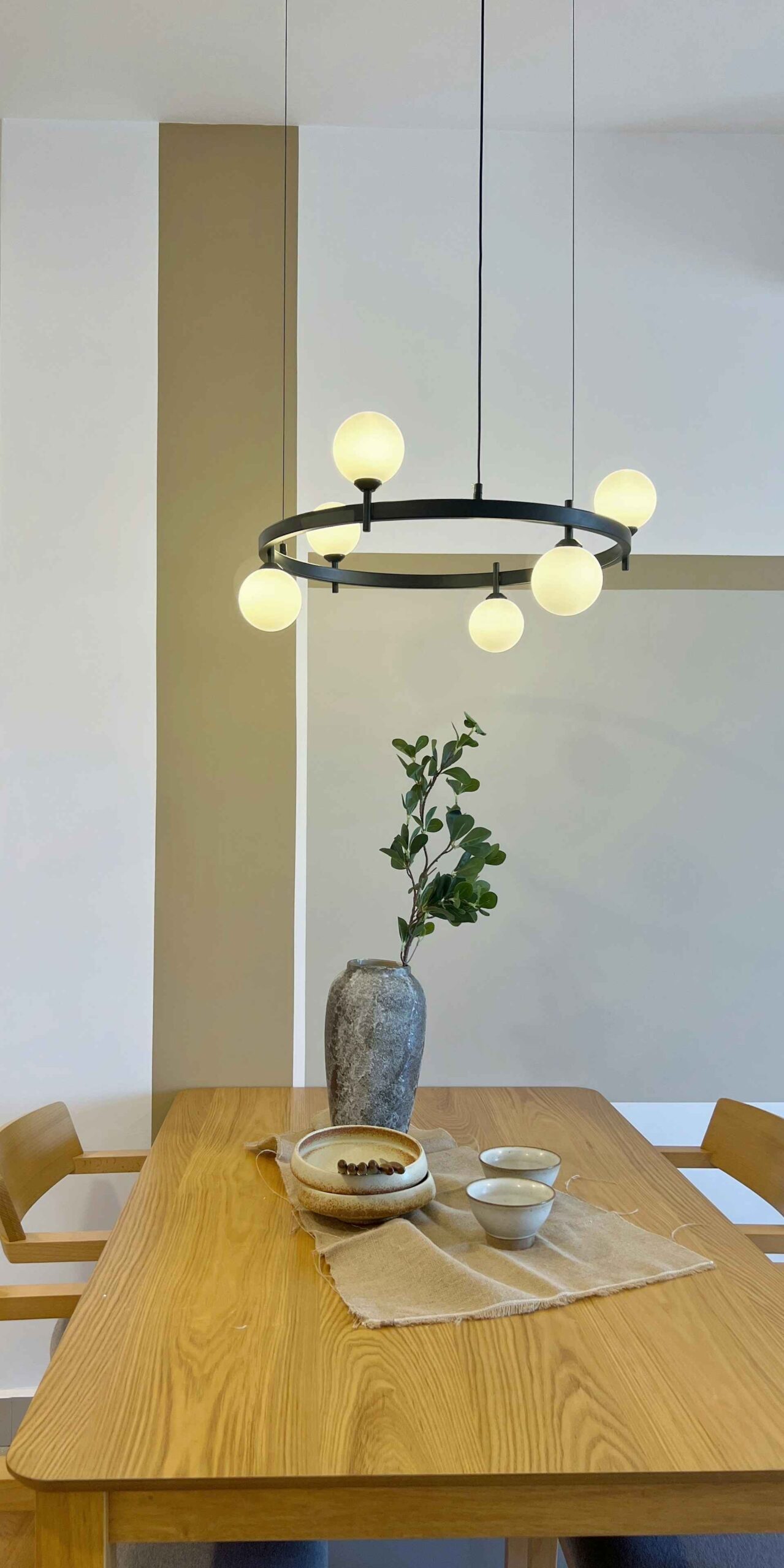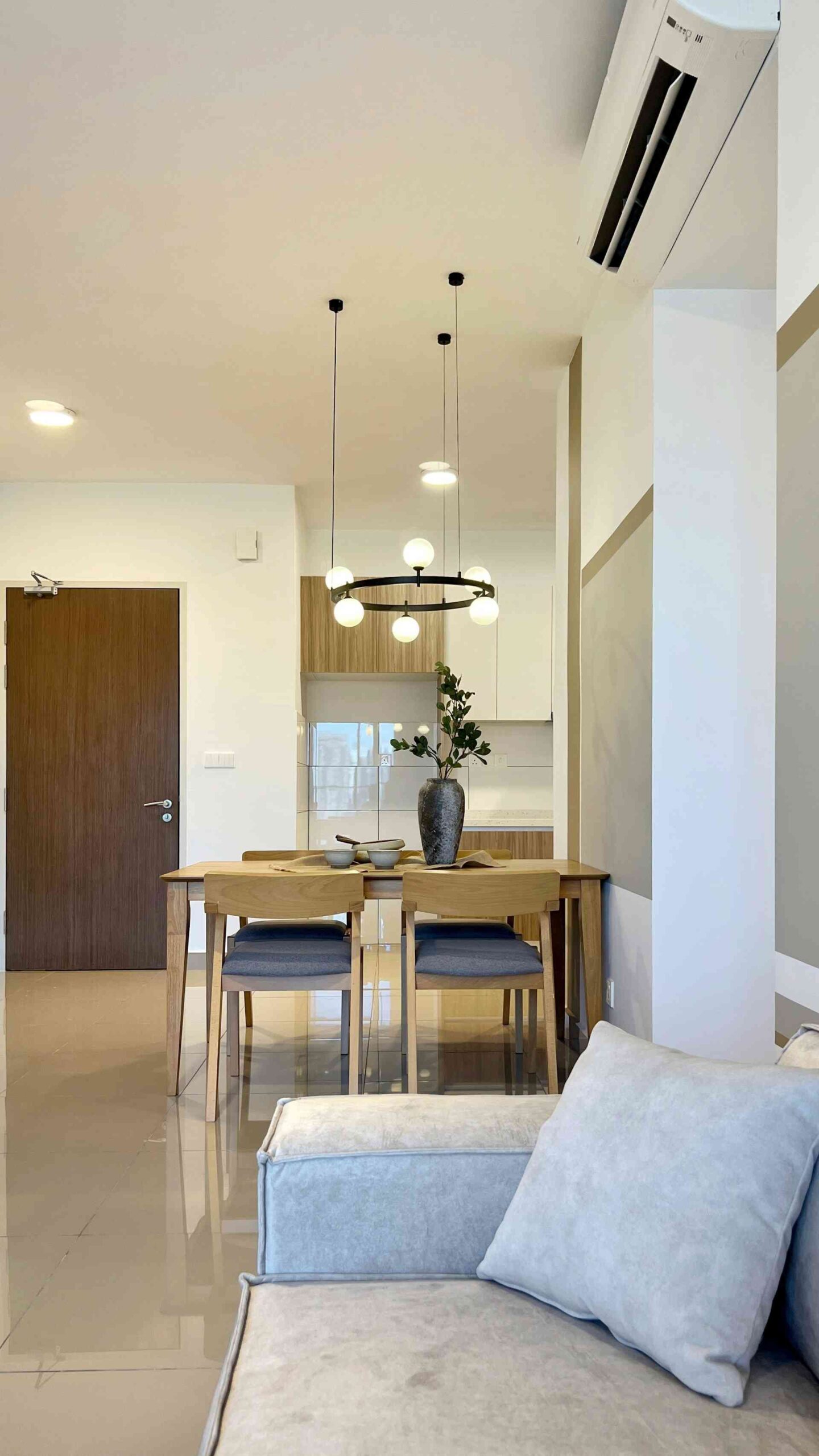 The interior features a bright open-plan living space, large windows with panoramic views, and carefully selected furniture in neutral tones. The dining area with a designer pendant light and a modern fitted kitchen adds style and functionality. Every detail has been executed to perfection, ensuring long-lasting quality.