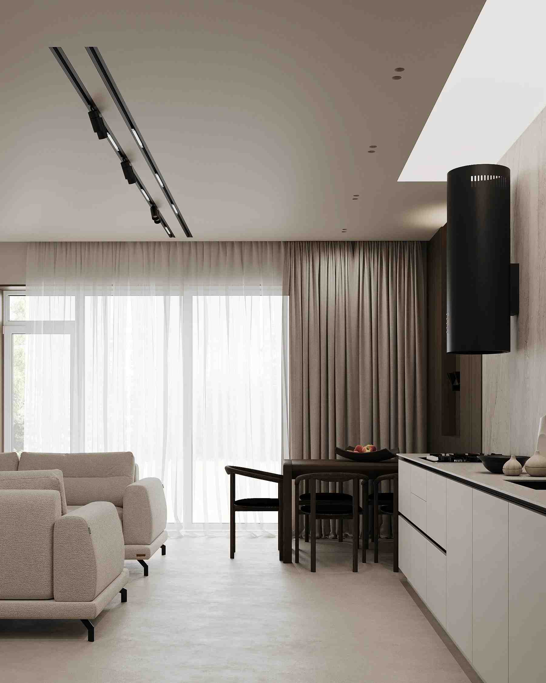 design project was comprehensive, covering everything from conceptual layouts to detailed drawings and furniture selection. In the main living area, large windows flood the space with natural light, blurring the lines between indoor and outdoor living. The open-plan layout connects the living room, dining area, and kitchen, making the space feel expansive and perfect for entertaining. We carefully selected every piece of furniture to be both stylish and comfortable, ensuring that the apartment is not just beautiful, but also highly functional.
