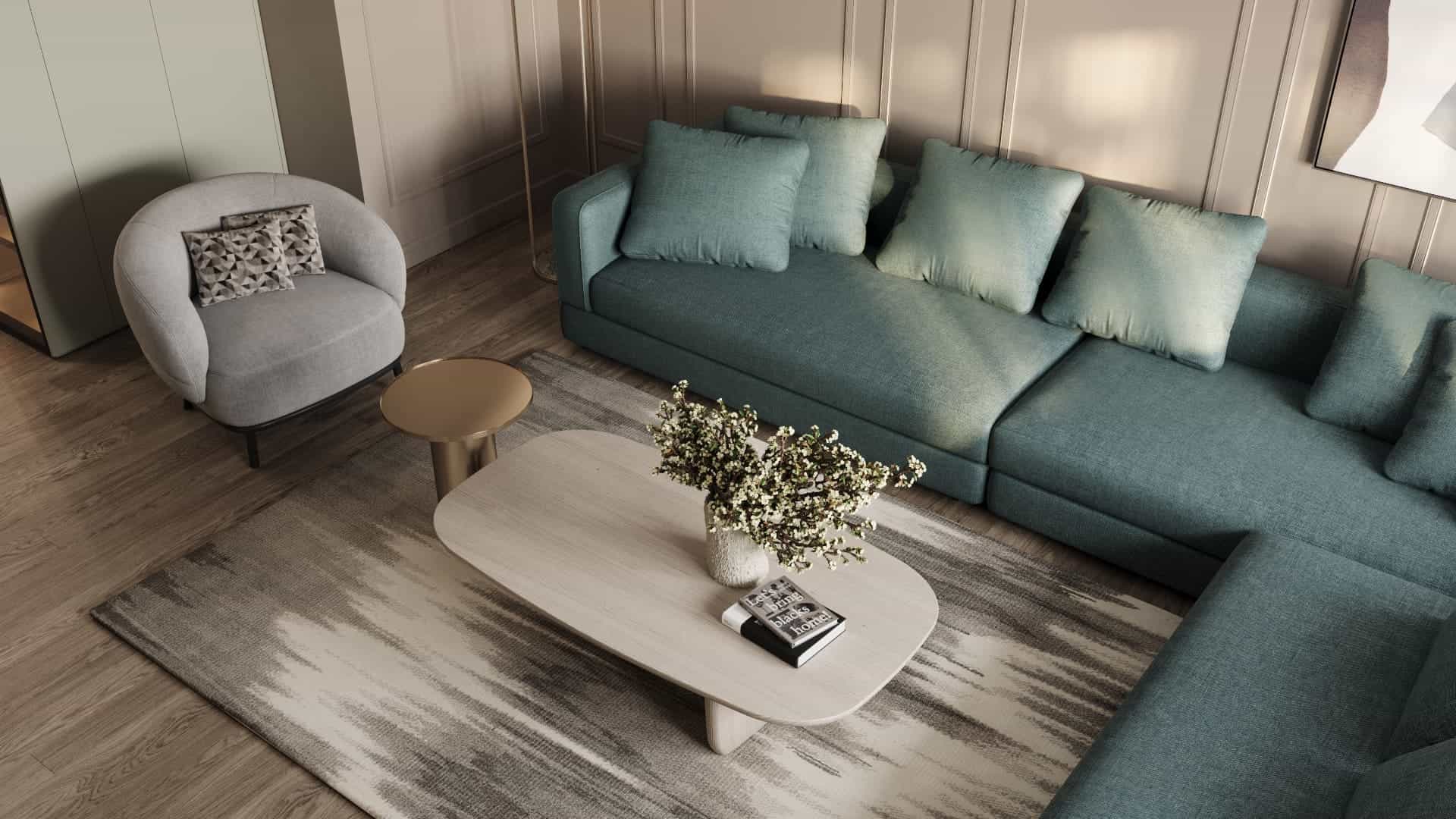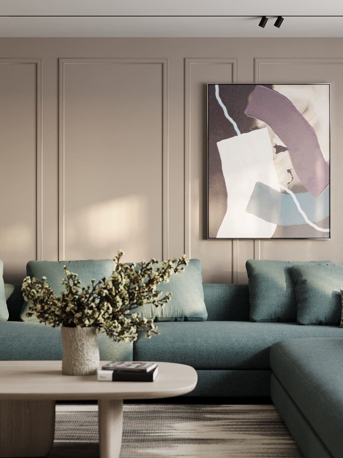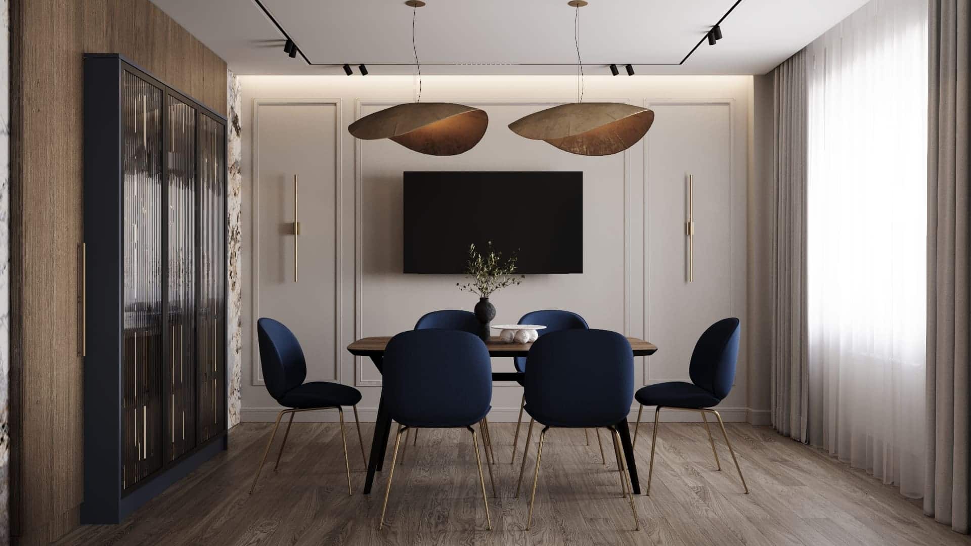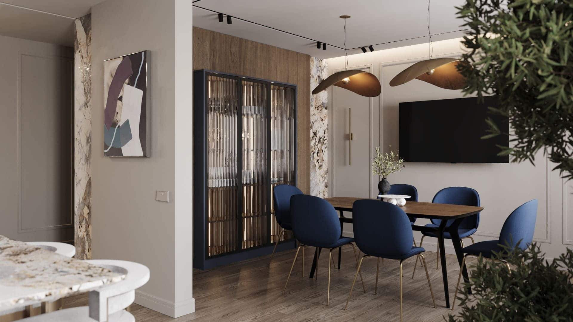 This eclectic design celebrates the art of contrast. Modern, sleek lines are softened by classic decorative elements, and a serene, neutral base is punctuated by pops of rich color like deep blue. The result is a seamless design project in Spain that feels both grand and intimate, a perfect sanctuary for a discerning client.