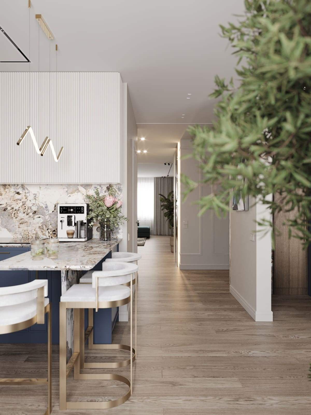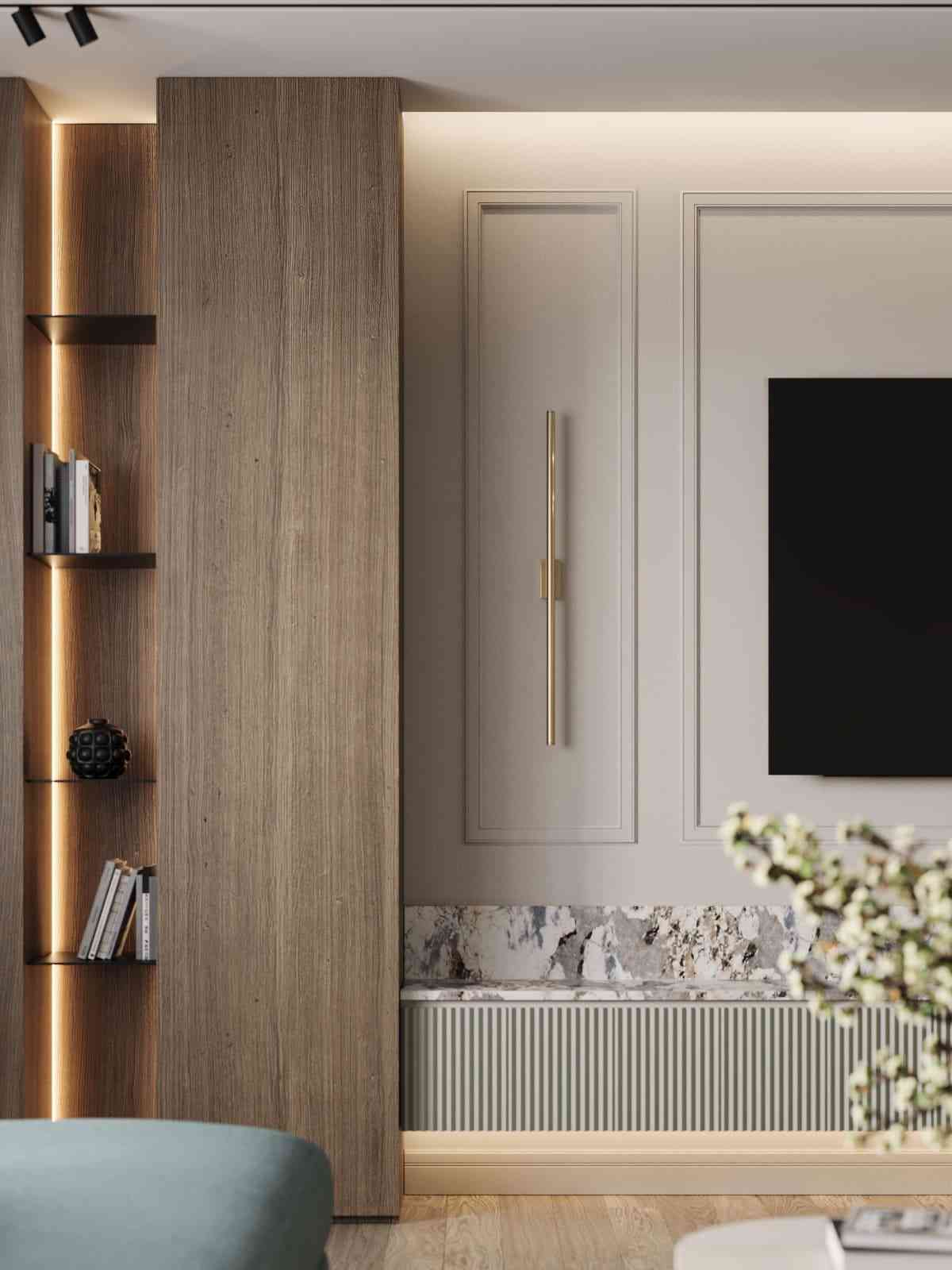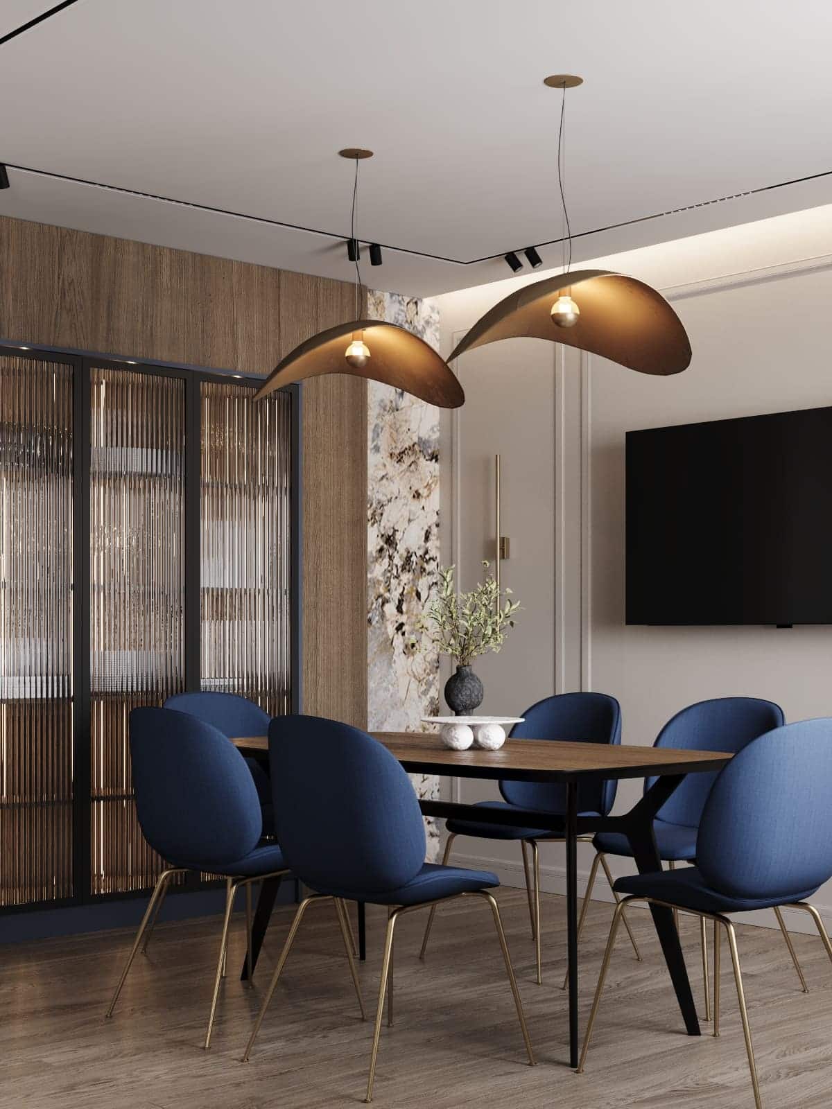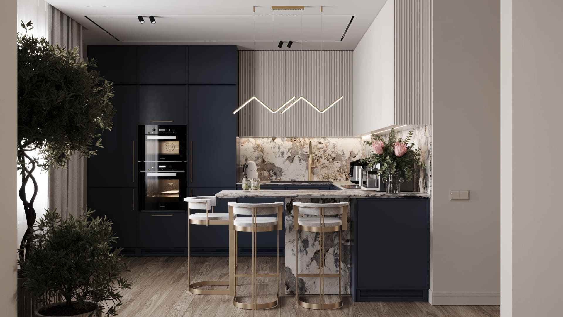 The heart of this luxury interior lies in its daring use of a diverse material palette. We combined the timeless beauty of marble with the warmth of rich, dark wood. Plush velvet furnishings and contemporary art pieces add depth and texture, while intricate tiling patterns in the bathroom and kitchen showcase a meticulous attention to detail. Every choice, from the statement lighting fixtures to the subtle molding on the walls, was made to elevate the space.