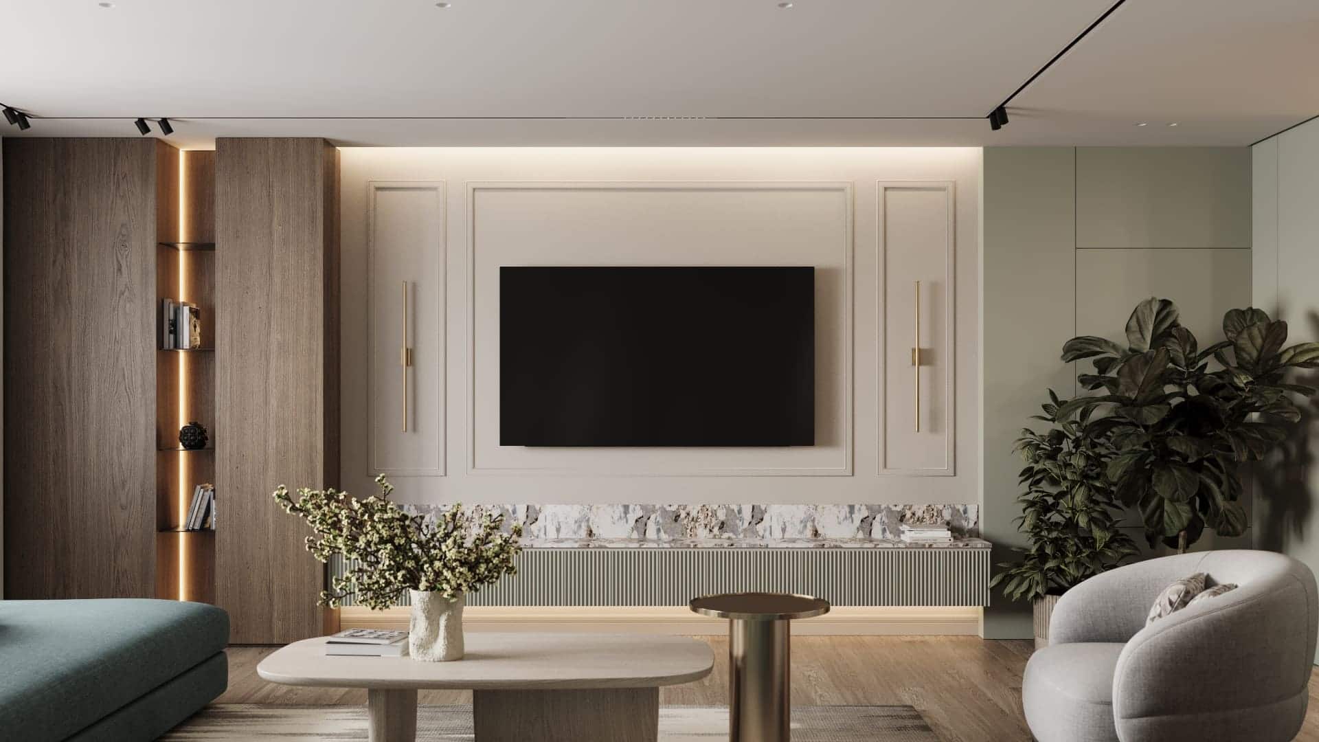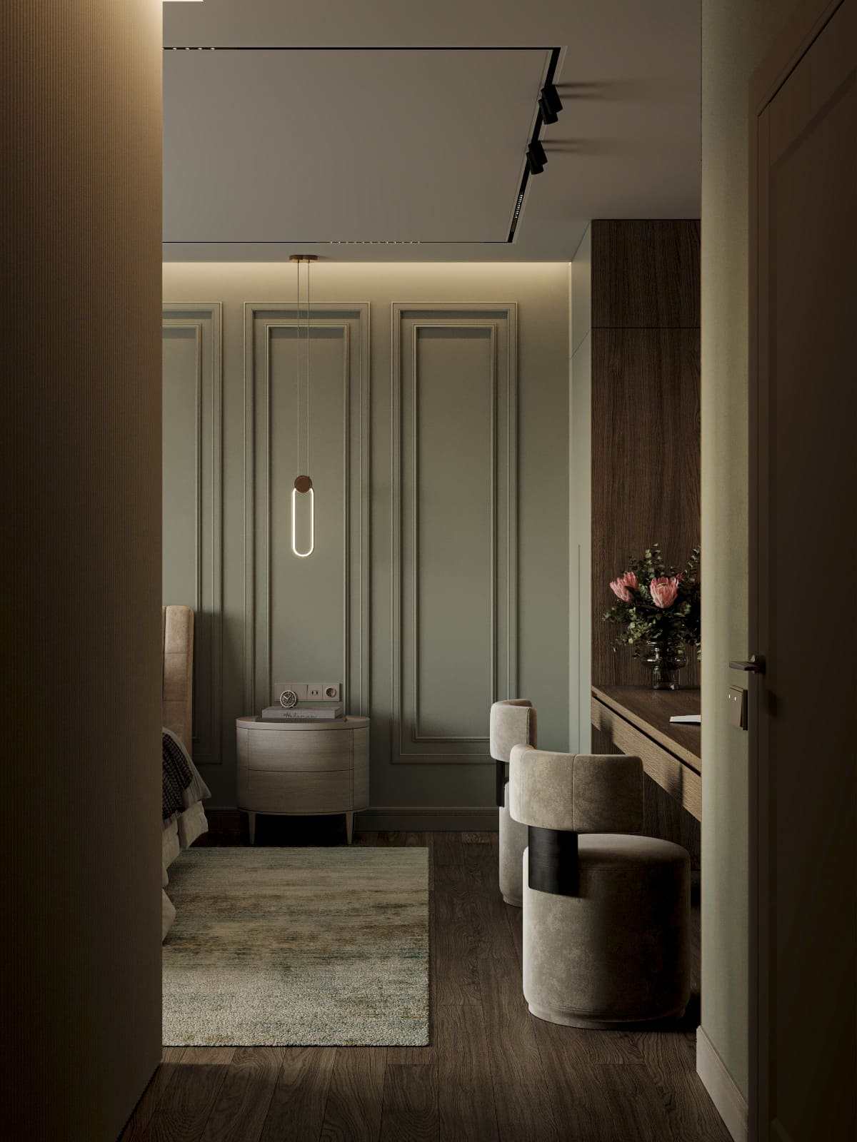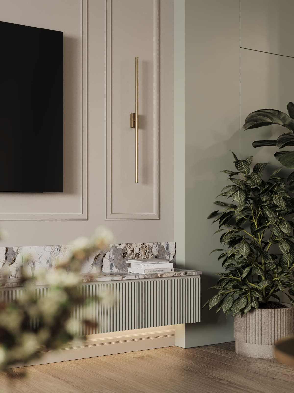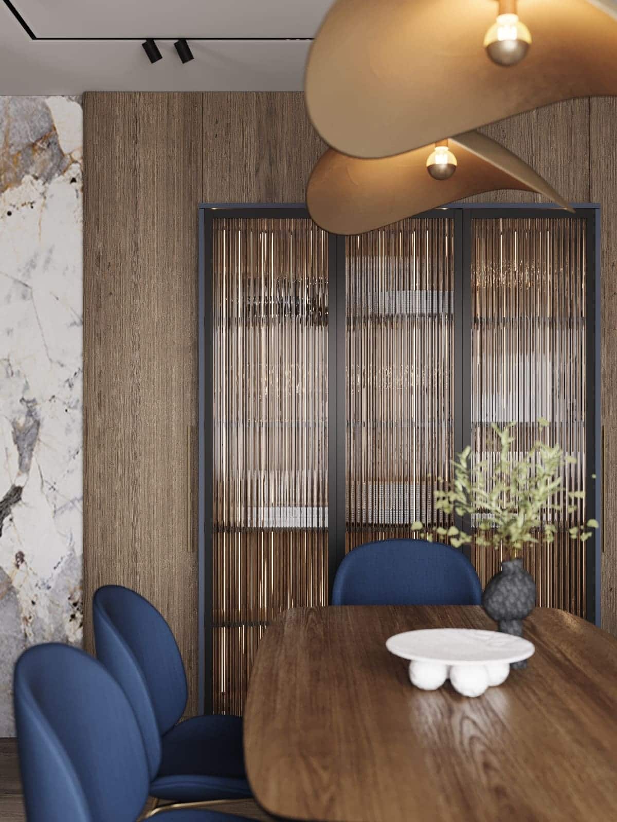 The heart of this luxury interior lies in its daring use of a diverse material palette. We combined the timeless beauty of marble with the warmth of rich, dark wood. Plush velvet furnishings and contemporary art pieces add depth and texture, while intricate tiling patterns in the bathroom and kitchen showcase a meticulous attention to detail. Every choice, from the statement lighting fixtures to the subtle molding on the walls, was made to elevate the space.