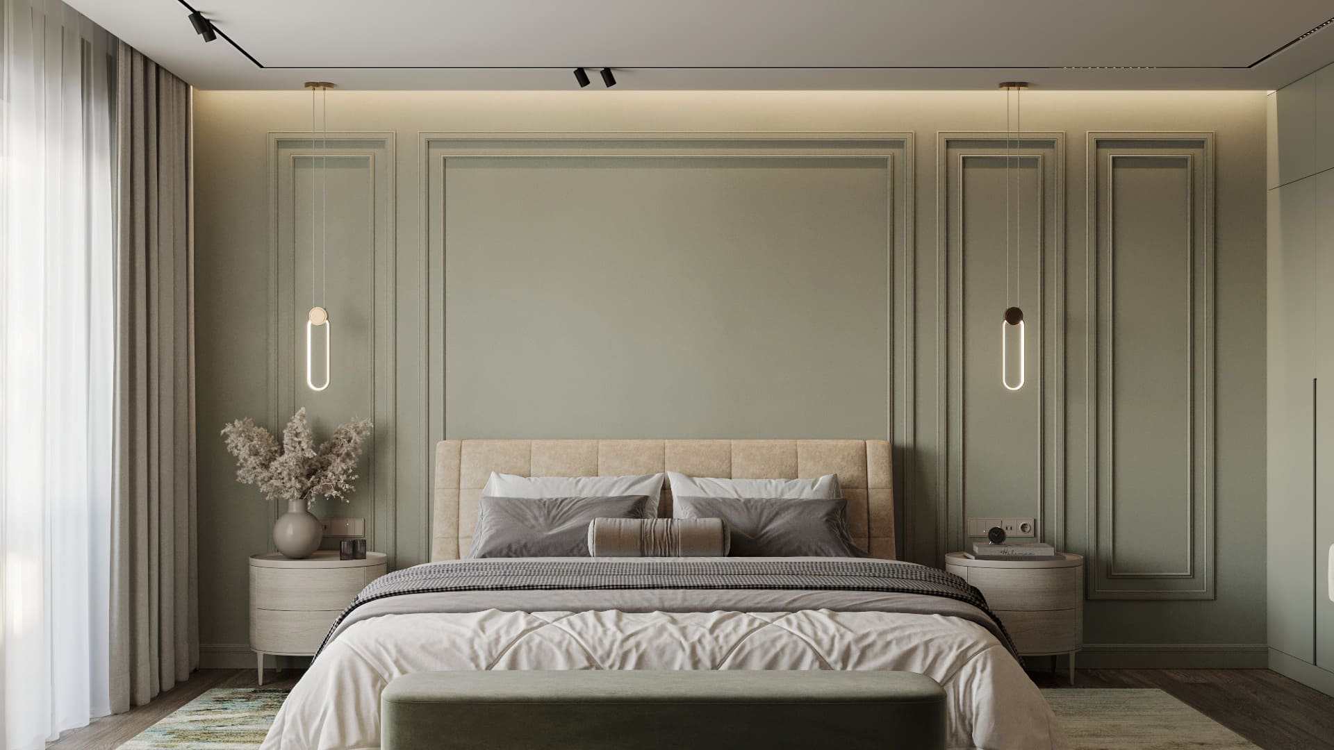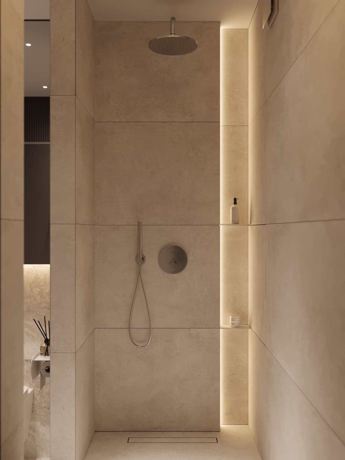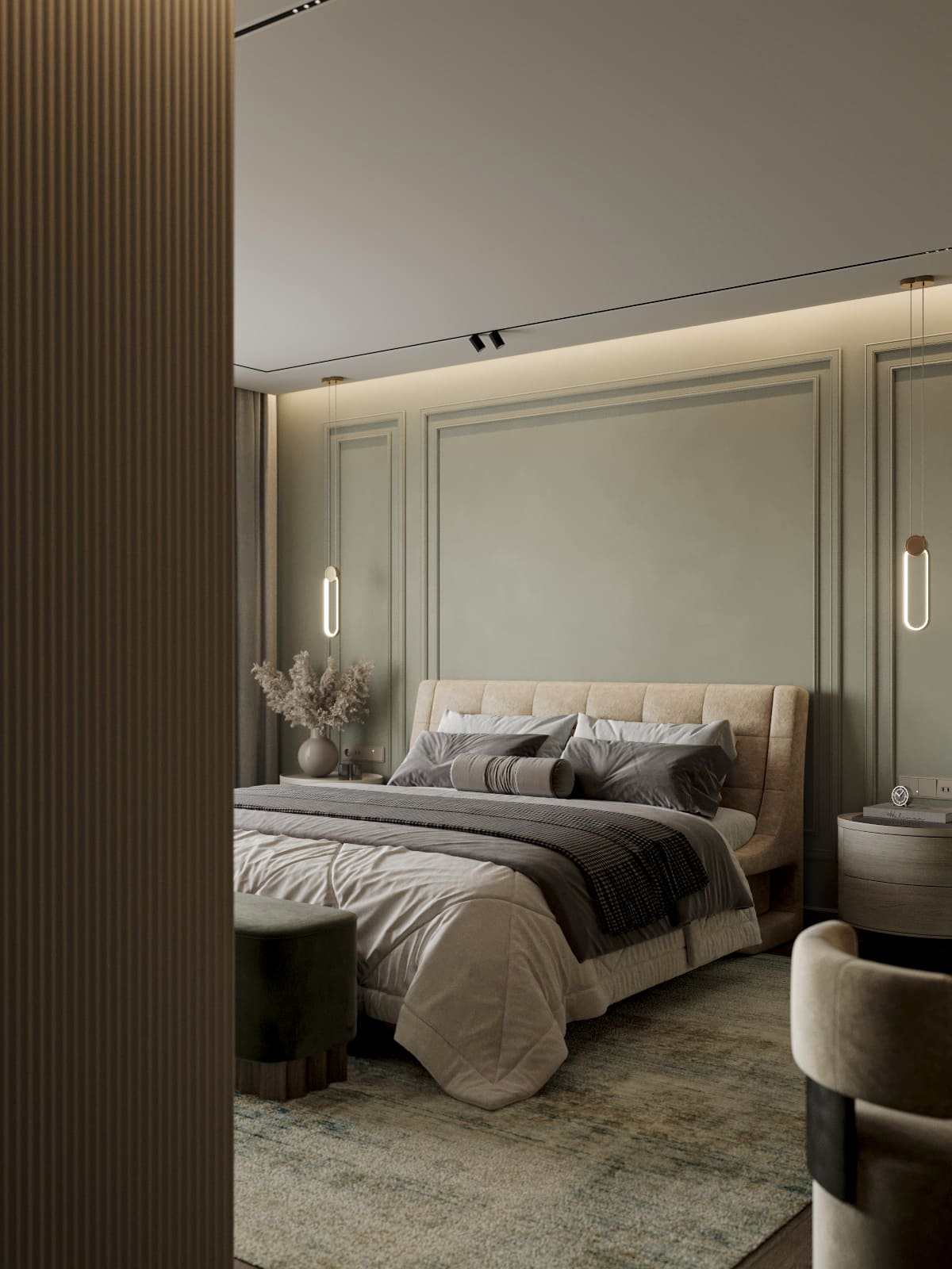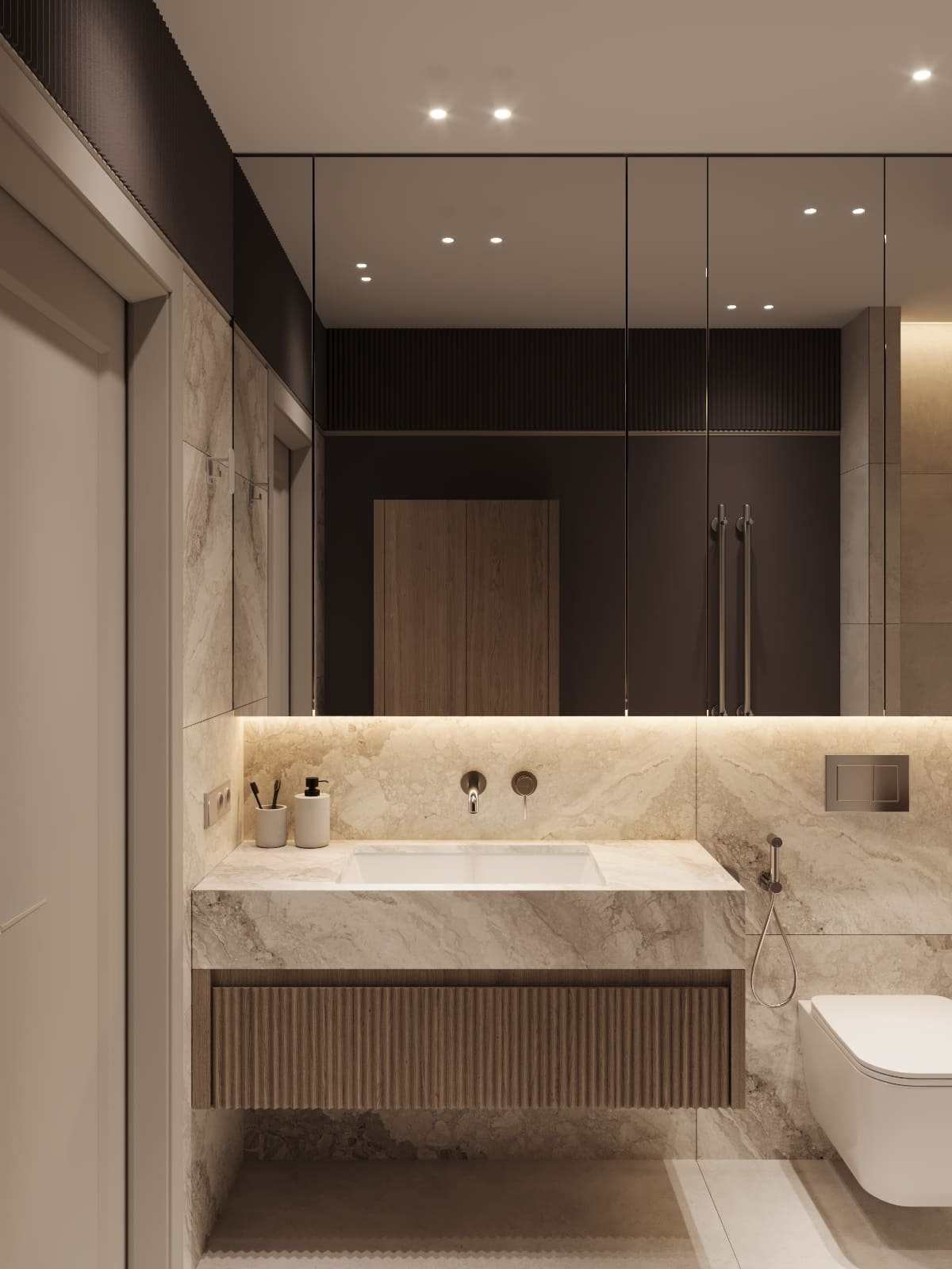 The heart of this luxury interior lies in its daring use of a diverse material palette. We combined the timeless beauty of marble with the warmth of rich, dark wood. Plush velvet furnishings and contemporary art pieces add depth and texture, while intricate tiling patterns in the bathroom and kitchen showcase a meticulous attention to detail. Every choice, from the statement lighting fixtures to the subtle molding on the walls, was made to elevate the space.